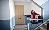Michael Sölgén är konvalescent efter en benamputation och är glad över upplägget med matutkörningar. Arla Ljungqvist-Petersson (med ryggen mot kameran) är del av en liten stab frivilliga som kör ut mat från Röda korsgårdens matservering. Foto: Daniel Eriksso