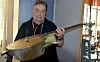 Staffan Malmström visar upp en av sina gitarrer. Den är gjord av ett gammalt tvättfat.<@Fotograf>Nina ErikssonFoto: Nina Eriksson