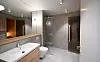 Samtliga badrum har samma material, men planlösningen varierar.Foto: Robert Jansson