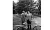 Atle Södergård och Nils Byman samtalar strax öster om Societetshuset i Mariehamn för omkring 70 år sedan. Eftersom Södergård har promenadkäpp och ett fältstaffli är fastspänt på cykelns pakethållare, får man förmoda att cykeln tillhör Byman. Foto: Carl-Eric Södergårdh