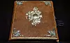 På pärmens insida finns ett sidenband med texten: “Till Julia och Abraham Öhberg af vänner i Mariehamn och Jomala, 1899.” Albumet var en avskedspresent till dem när de flyttade från Åland. Det går att bläddra i det i digitaliserad form på utställningen.Foto: Hülya Tokur-Ehres