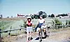Fotografen Rune Berglunds fru, Margit Nordberg (1926–2021), står till vänster med sonen Stefan (f. 1958) på axlarna. Flickan med cykeln har identifierats som Rudolf Karlssons dotter, Ester.