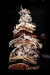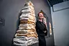 ”Det var som att leka med vuxenlego”, säger Tiina Tahvanainen om byggandet av sin bokskulptur. Längst ner i högen finns den första boken, som hon hittade i vattenbrynet.