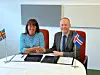 Annette Holmberg-Jansson och Guðmundur Ingi Guðbrandsson skakar hand över samarbetsavtalet.