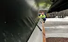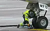 Markarbetarna lägger ut koner nära motorn och under vingarna så att passagerarna inte ska gå för nära dem.Foto: Robert Jansson