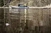 Karl-Johan Henriksson och Ann Nedergård sänker ned två säckar biokol i träsket.