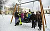 Hela Sottunga gläder sig åt att det har kommit barn till bygden. Här leker Micko, Leah, Alexander, Pan och Jamie. I bakgrunden syns Shato, Elsa, Benjamin, Jonny, Henrik och Yo-Shi.Foto: