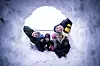 Barnen har längtat efter snön. Från vänster syns Elias Lindholm, Stefan Botoc, Yanis Botoc, Louise Lindholm, Oscar Lindholm och Hugo Lindholm.