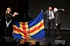 Ulf Grüssner, till höger, överraskas med en flagga av Monica von Frenckell och Bosse Karlsson.