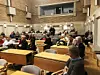 Ett 50-tal personer hade tagit sig till stadshuset för att lyssna och framföra åsikter om den tilltänkta discgolfbanan på Lotsberget i Mariehamn.
