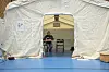 Ett evakueringscenter består av flera delar: registreringsplatser, matområden, första hjälpen-rum, barnområden och platser för hjälpsökande som behöver mentalt stöd. I helgens övning sattes även ett så kallat evakueringstält upp. På insidan syns Mikaela Brandt-Lindholm från KST.