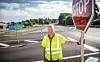 Vägmästare Robert Karlsson står på den nybyggda refug som har satts upp i Godbykorsningen, och fungerar som ett skydd i trafiken.Foto: Hülya Tokur-Ehres