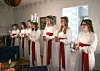 Årets åländska luciafölje med lucia Tindra Karlsson och tärnorna Fanny Jörgensen,Emma Sahlin, Klara Westerholm, Emilia Strandvik, Smilla Påvall och Elin Lindholm.