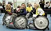 Drake Haux och Gaia Star Haux till vnster i bild tog chansen att testa på rullstollsrugby i går. I bakgrunden syns Carl Boström från Uppsala Wheelchair Rugby.Foto: DANIEL ERIKSSON