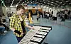 Sara Engström från ungdomsorkesterns styrelse visar hur man spelar på en vibrafon. Foto: DANIEL ERIKSSON