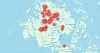 Skärmdump från Ålands elandelslags hemsida. De röda bollarna visar var avbrotten finns.