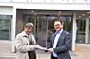 Rauli Lehtinen från föreningen Rädda Lumparn lämnar över skrivelse till utvecklingsminister Alfons Röblom.