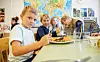 Eleverna i Eckerö skola får beröm av kocken för att de vågar testa nya smaker. Till vänster Oliver Löfström och Hanna Christensen och till höger Wilma Sjölund (längst fram), Rakel Karlsson och Ludvig Eriksson.Foto: Hülya Tokur-Ehres