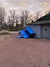 ”Här hörde jag ett himla liv när jag pluggade, tittade ut och såg att taket till carporten var försvunnet. Det återfanns hos grannen efter en vända mot deras fasad, och räddningstjänsten fick komma och säkra taket”, berättar Linnéa Svenblad.