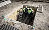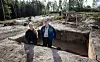 Arkeologerna Victoria Gottberg och Rudolf Gustavsson samt Jenni Lucenius som leder utgrävningsarbetena i ett av de djupaste schakten som man grävt i sandtaget.Foto Daniel ErikssonFoto: DANIEL ERIKSSON