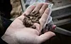 Jenni Lucenius finkammar jorden. När man studerar sanden noga, ser man överallt små vit-gula prickar som är rester av olika ben. Foto Daniel ErikssonFoto: DANIEL ERIKSSON