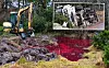 På bilden syns delar av läckaget samt lastbilen som hamnat på sniskan i diket.