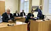 Vd Henrik Lundberg syns i mitten, längst bak i salen, omringad av jurister.