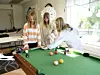 Livia Franzas, Ida Häggblom och Lia Båskman spelar biljard på ungdomsgården.