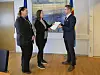 Alyssa Bittner-Gibbs och Josefine Egenfelt överlämnar förslaget om stöd för byte av enskilda avlopp till närings- och miljöminister Jesper Josefsson.