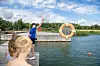 Simlärare Ellen Woivalin demonstrerar hur man kastar ut en livboj på simskolan på Notplan i Saltvik, förra året.