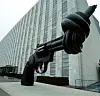 Carl Fredrik Reuterswärd skulptur ”Non-Violence” utanför Förenta Nationernas högkvarter i New York.