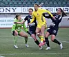 Åland Uniteds Sarah Melén, Sara Nordin och Ella Degerstedt gör allt för att stoppa HJK:s Emmaliina Tulkki .
