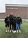 Elton Jalava, Axel Hildén och Bohdan Kryzhnii tillsammans med tränaren Martin Falkeborn framför Jari Litmanen Arena i Eerikkilä.