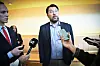 Sverigedemokraternas partiledare Jimmie Åkesson (SD) anländer sent till en pressträff.
