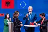 Albaniens premiärminister Edi Rama mellan ordförandelandet Danmarks EU-minister Marie Bjerre och EU:s utvidgningskommissionär Marta Kos vid måndagens öppnande av ytterligare förhandlingskapitel i Bryssel.