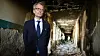Tobias Thyberg när han var ambassadör i Ukraina. Här vid ett besök i juni 2022 i en sönderbombad skola i byn Velyka Dymerka öster om Kiev.