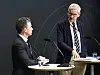 Försvarsminister Pål Jonson och särskilda utredaren Carl Bildt under pressträff i samband med överlämnandet av underrättelseutredningen.