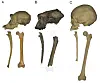 Kraniet, armbågsbenet och lårbenet av (från vänster till höger) en schimpans, Sahelanthropus och en modern människa. Studier av benen från Sahelanthropus visar att arten med stor sannolikhet var tvåbent.