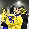 Sveriges femmålsskytt Christoffer Edlund kysser VM-bucklan efter finalkrossen.
