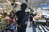 En polisman på plats på den populära matmarknaden Or Tor Kor där fem säkerhetsvakter sköts till döds på måndagen.