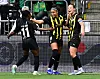Felicia Schröder, mitten, kramades om av Monica Jusu Bah och Anna Anvegård efter Häckens avgörande 1–0-mål borta mot Hammarby.