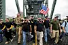 Proud Boys marscherar med andra extremistgrupperi Portland, Oregon, i augusti 2019. Den tidigare ledaren Enrique Tarrio, med megafon i handen, är en av de fem som nu stämmer USA:s regering.
