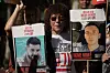 En kvinna bär på porträtt av Ziv Berman och Matan Angrest under en demonstration den 7 oktober. De båda männen tillhör de 20 ur gisslan som tros vara vid liv.