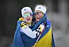 Sveriges Frida Karlsson (höger) tog guld och Ebba Andersson silver i damernas skiathlon under vinter-OS i Val di Femme i Italien.
