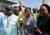 Nigerias lagkapten Rasheedat Ajibade, i mitten, med pokalen efter hemkomsten från segern i afrikanska mästerskapen 2025. Årets mästerskap har skjutits upp i sista stund. Arkivbild.