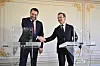 Sverigedemokraternas partiledare Jimmie Åkesson och Moderaternas partiledare Ulf Kristersson tar i hand efter onsdagens gemensamma pressträff.