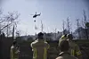 Israeliska brandmän ser på när en helikopter släpper vatten över bränderna.