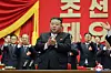 Nordkoreas högste ledare Kim Jong-Un när han programenligt återvaldes som generalsekreterare för det styrande Arbetarpartiet på söndagen. Bild förmedlad av det nordkoreanska styret.