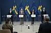 Näringsutskottets ordförande Tobias Andersson (SD), energi- och näringsminister Ebba Busch (KD), klimat- och miljöminister Romina Pourmokhtari (L) och finansmarknadsminister Niklas Wykman (M) håller pressträff på kärnkraftsområdet.