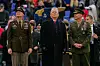 USA:s president Donald Trump, omgiven av generallöjtnanterna Steven Gilland och Michael Borgschulte vid ett militärt sportevenemang i Baltimore i december.